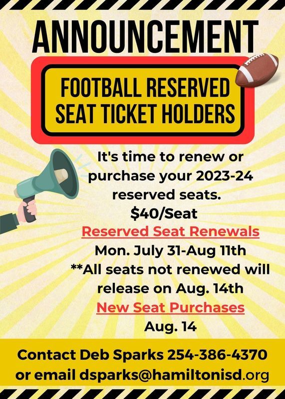 School starting means athletics is around the corner! It's time to renew your reserved seats for the 23-24 football season!
