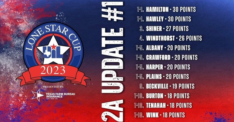 Hamilton and Hawley are TIED atop the 2A standings of the UIL #LoneStarCup presented by Texas Farm Bureau (Update #1) with one #UILState title a piece in Girls XC (Hamilton) and Football (Hawley).