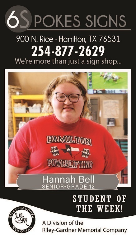 6 Spoke Signs and the Hamilton Herald News Present your Student of the Week, Senior Hannah Bell. Hannah is the Drum Major for the Hamilton High School Fighting Bulldog Band and competed at State Power Lifting last year where she finished 7th!
